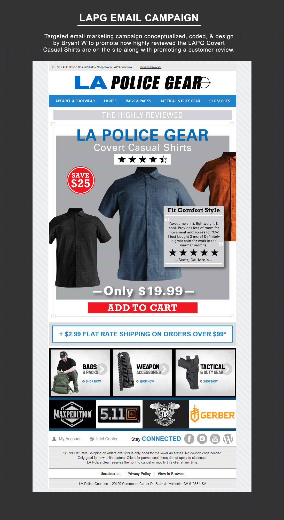 Email marketing campaign set out to LAPG's customer base to highlight the highly reviewed covert casual shirts.