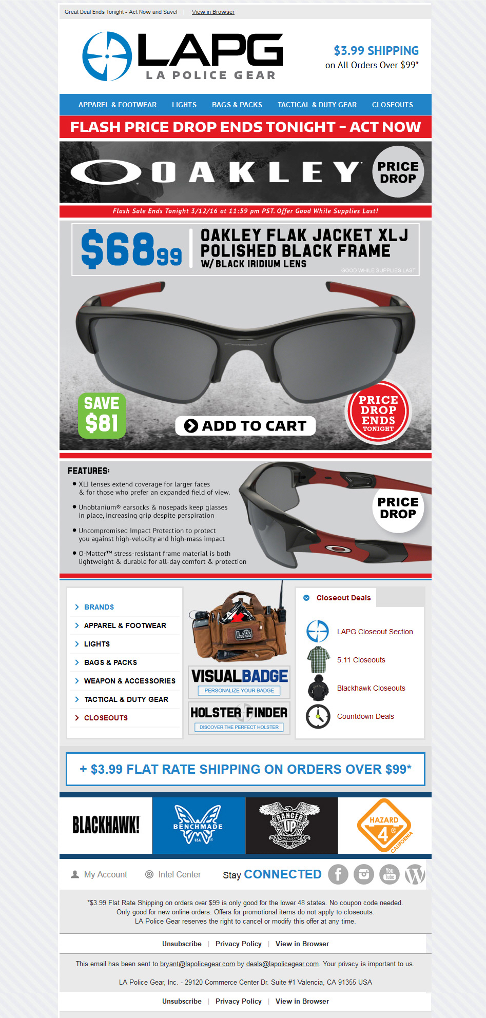 Marketing Email Promotion Design For LAPG Advertising An Oakley Product Price Drop Sale.